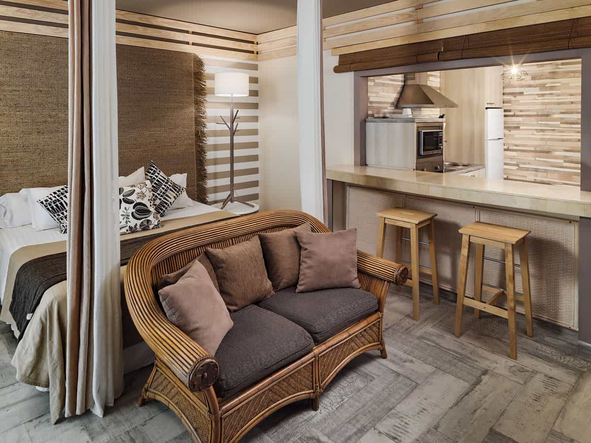 Con 90 m² distribuidos en dos plantas, nuestras villas de 2 dormitorios ofrecen espacio y comodidad para hasta 6 personas, ideales para familias o grupos. En la planta superior encontrarás un dormitorio, baño con ducha, cocina totalmente equipada, salón y un balcón con vistas al mar en la distancia. En la planta baja, otro dormitorio adicional, un segundo baño y acceso a una terraza privada con cama balinesa, rodeada de palmeras, perfecta para relajarte en un entorno natural.